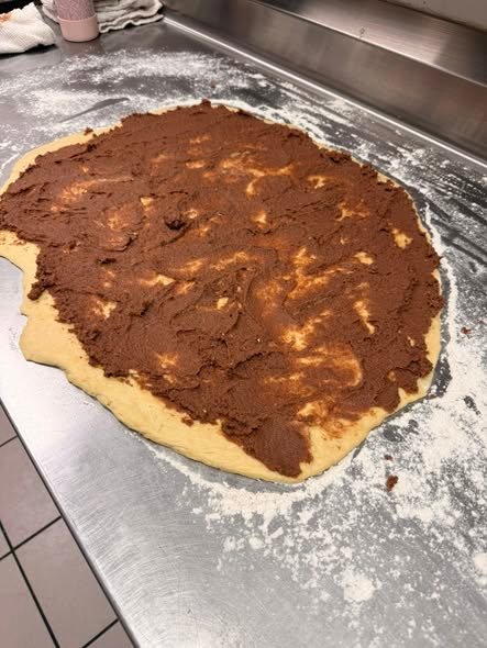 Roll the dough into a rectangle about 16×12 inches. Spread softened butter evenly over the surface, then sprinkle the cinnamon-sugar mixture on top.