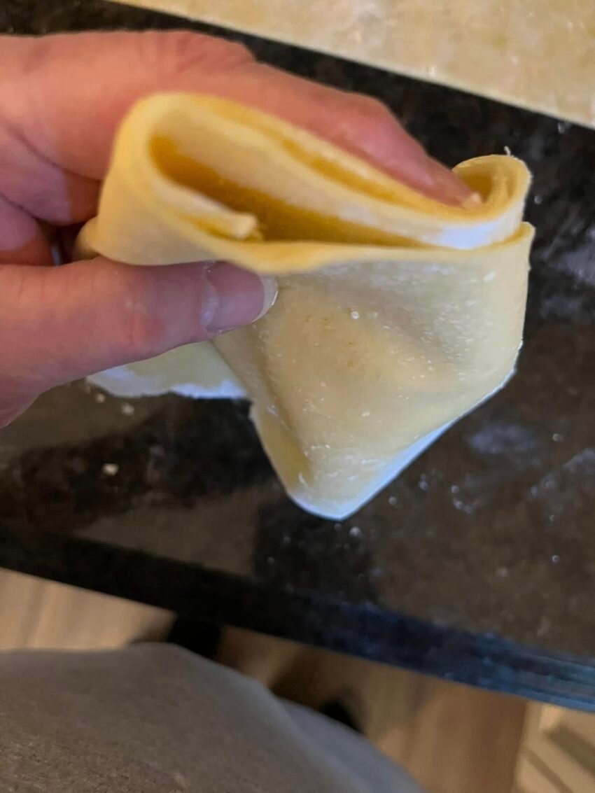 Divide the dough into two portions. Roll each portion on a lightly floured surface until very thin—about 1–2 mm thick. Let the rolled dough rest for 5 minutes so it firms slightly.