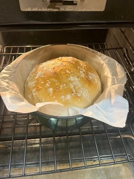 Carefully transfer the dough to the preheated Dutch oven or baking sheet.