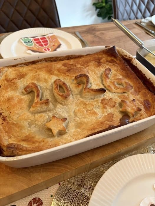 Transfer the beef mixture to a pie dish. Roll out the puff pastry and cover the pie, trimming excess and pressing edges to seal. Cut small slits in the top to allow steam to escape. Brush the pastry with beaten egg.