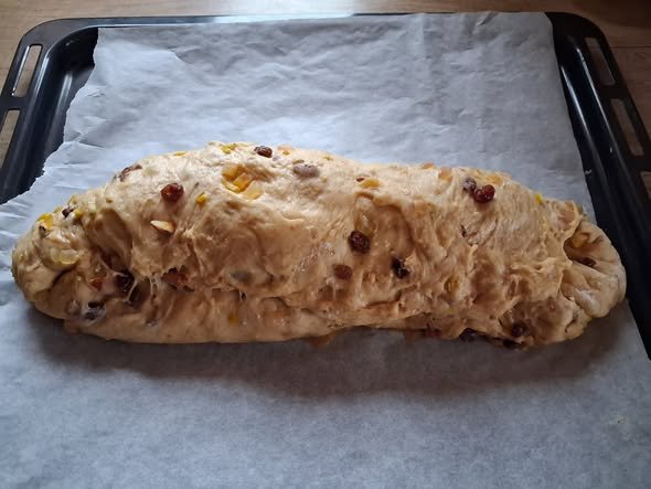 Punch down the dough and roll it into an oval shape. Fold one long side slightly over the other to create the traditional Stollen shape. Place it on a parchment-lined baking sheet.